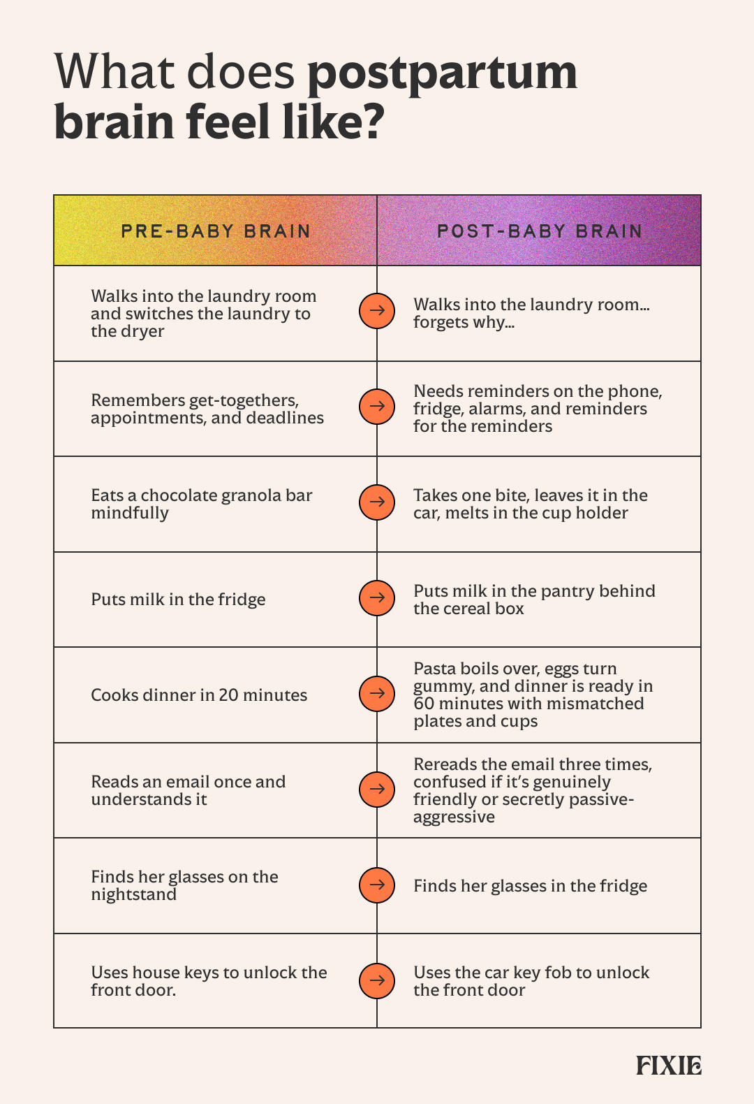 It varies from mom to mom and can linger well beyond the initial postpartum period. One study found that total gray matter volume and cortical thickness decreased as pregnancy progressed, and only partially bounced back after birth. Some research suggests these changes can last up to six years after childbirth (and if you’re like our editor Saralyn and have your last kid at 38, 6 years is just long enough for perimenopause brain fog to kick in! Double whammy!).