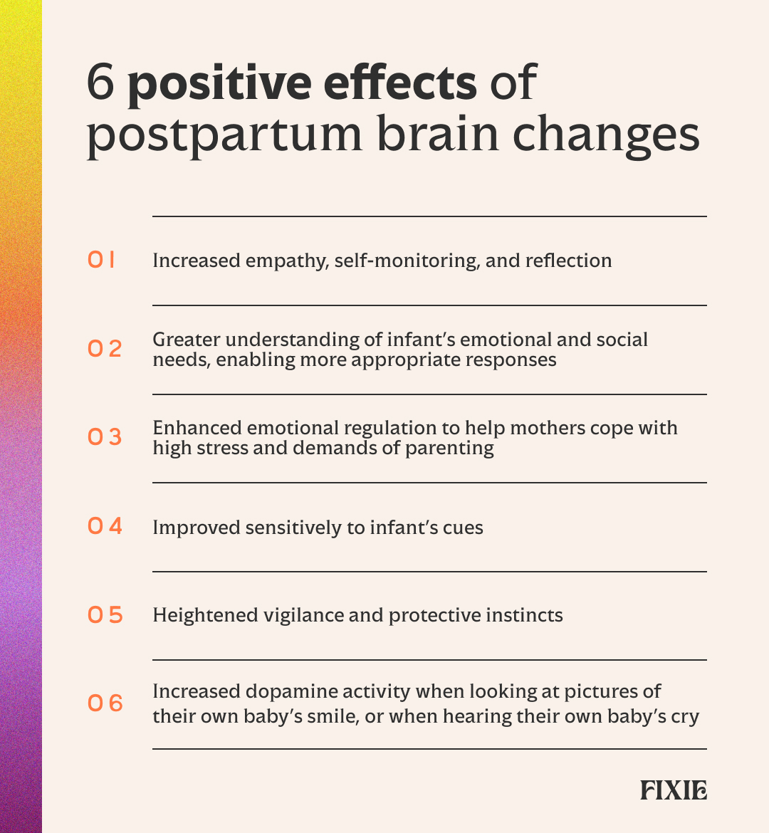 The silver lining of these structural brain changes is that it helps your brain focus its resources on the responsibilities and mental demands of motherhood. “A mother's brain doesn't just "adjust" after giving birth, it actually goes through dynamic rewiring that literally reshapes a mother's brain to promote positive mother-infant bonding and acclimates us to our new role of motherhood,” says Lopez. In other words, your brain is rewiring itself to help you respond better to your baby’s needs, even if it means forgetting where you parked the stroller.
